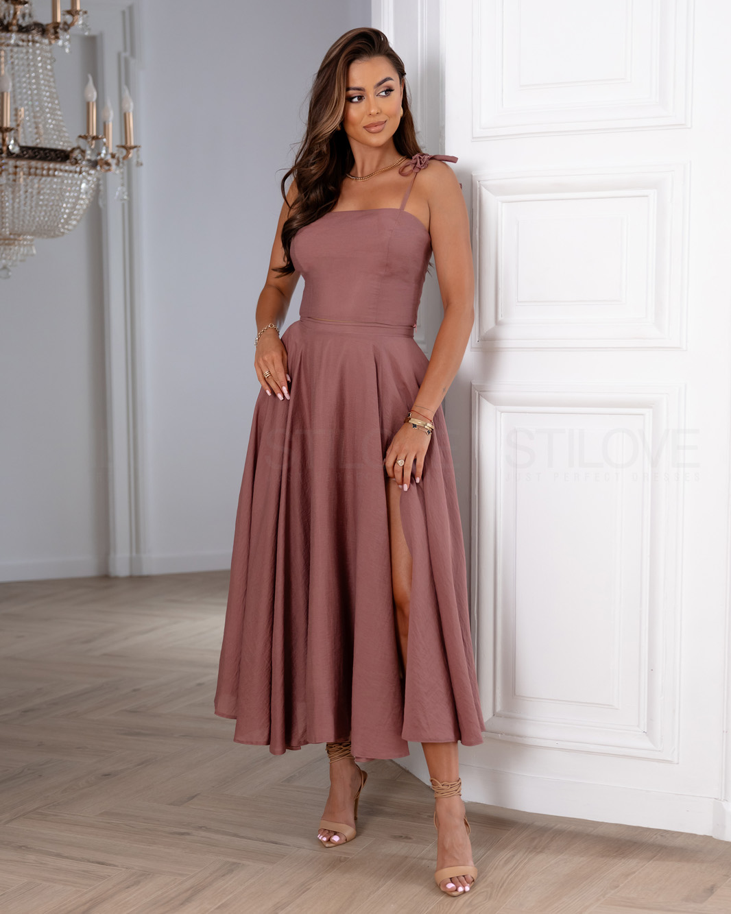 - Kloszowana spódnica z rozcięciami, która pięknie układa się w ruchu