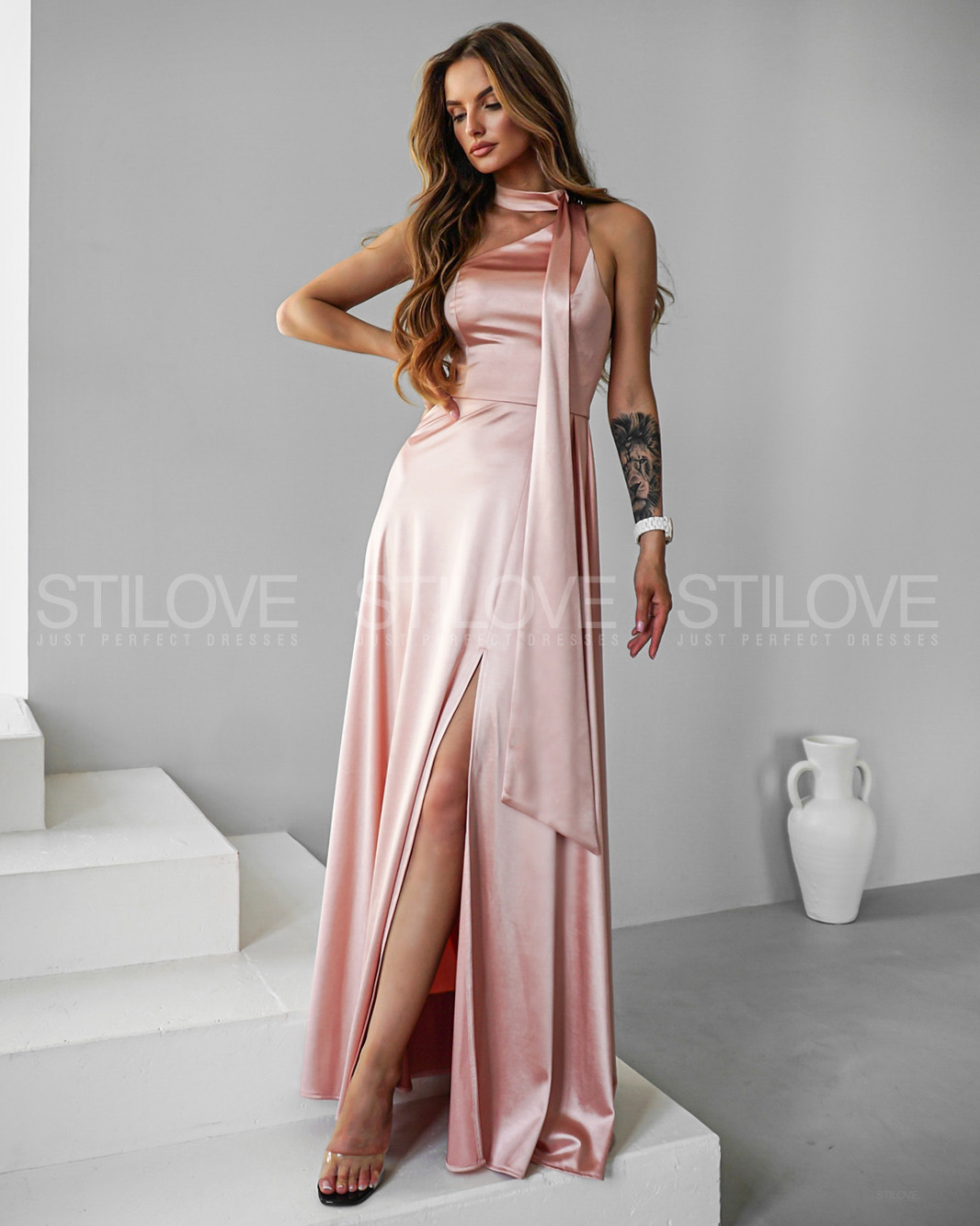 Poznaj suknię, która łączy w sobie subtelność, zmysłowość i kobiecą elegancję. Jej asymetryczny krój pięknie eksponuje sylwetkę, a regulowany choker z ozdobną szarfą dodaje szyku i wyjątkowego charakteru.