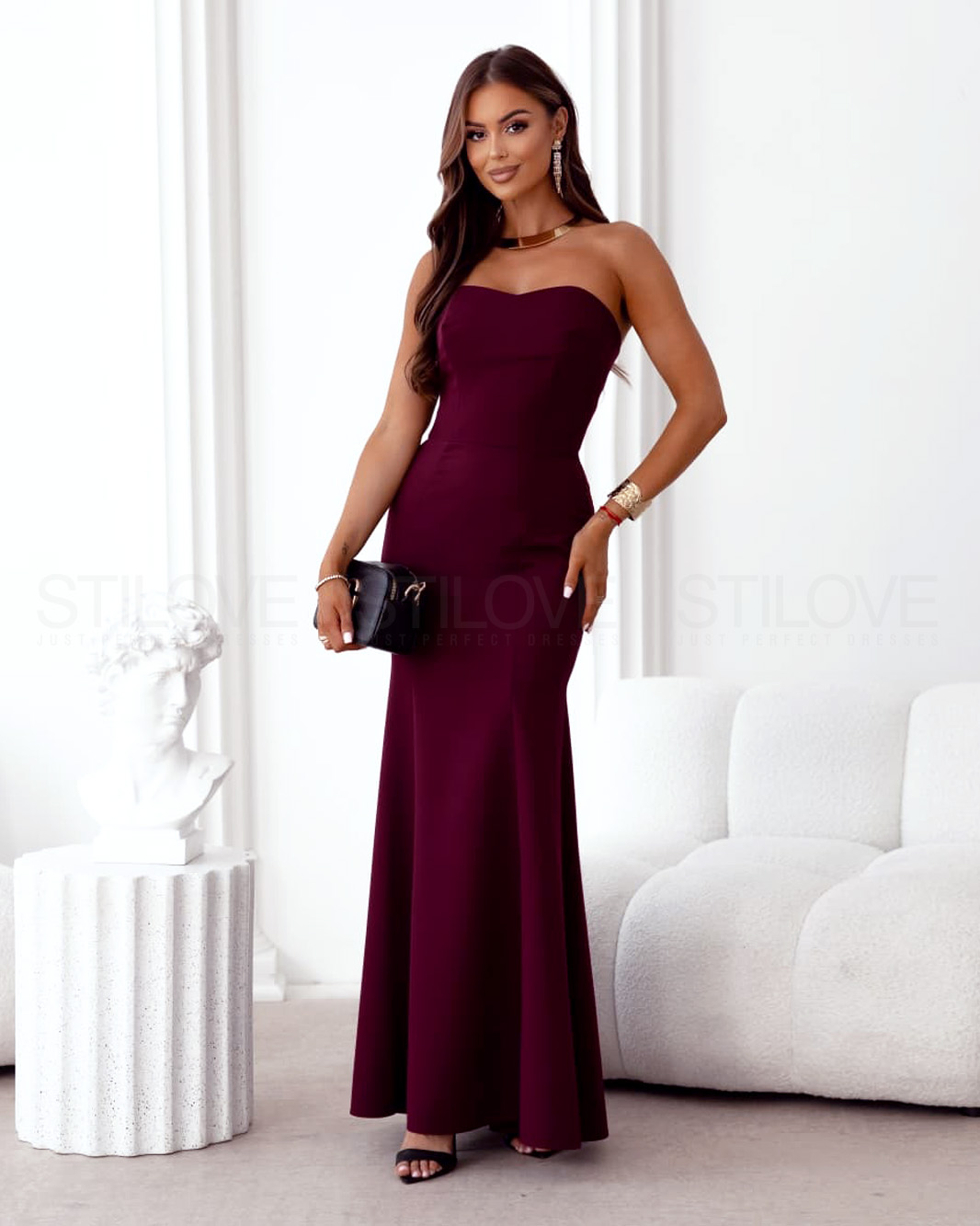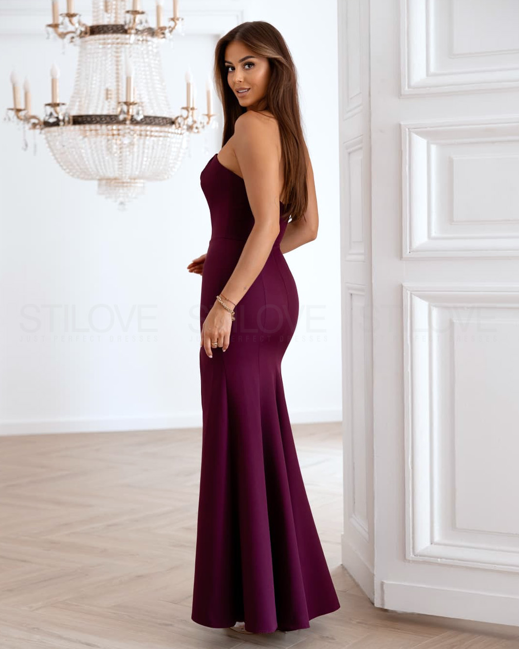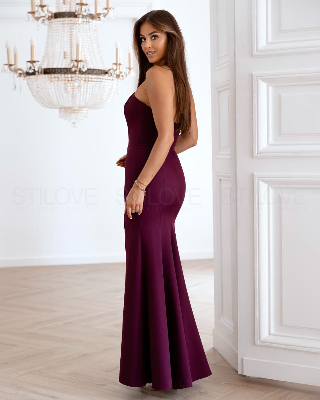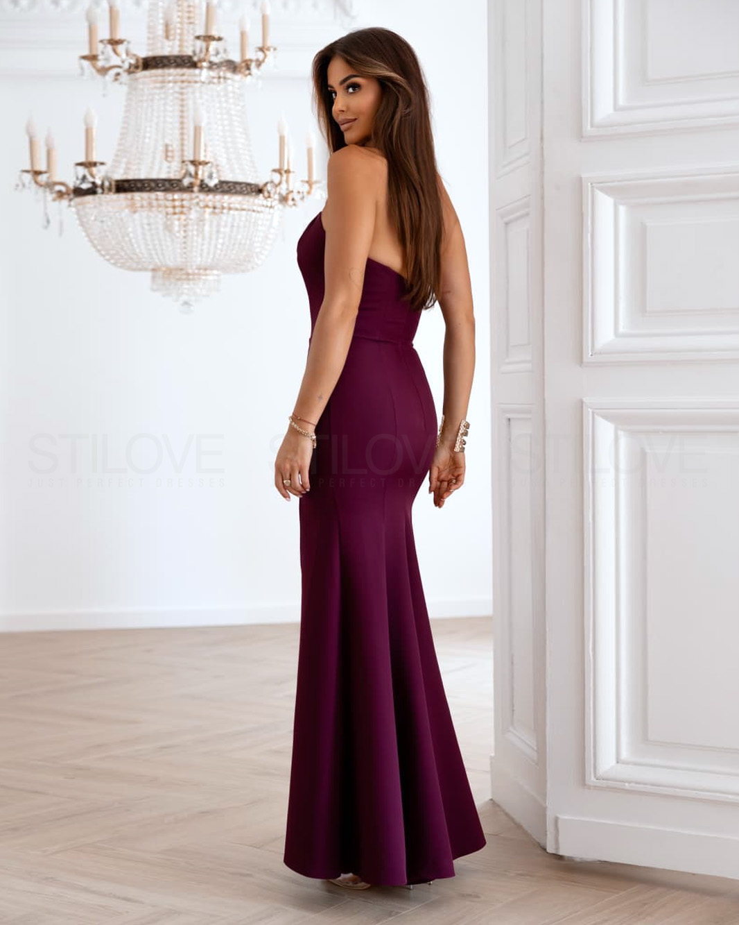 Elegancka, d艂uga suknia o dopasowanym kroju, kt贸ra perfekcyjnie podkre艣la sylwetk臋 i akcentuje kobiece kszta艂ty.