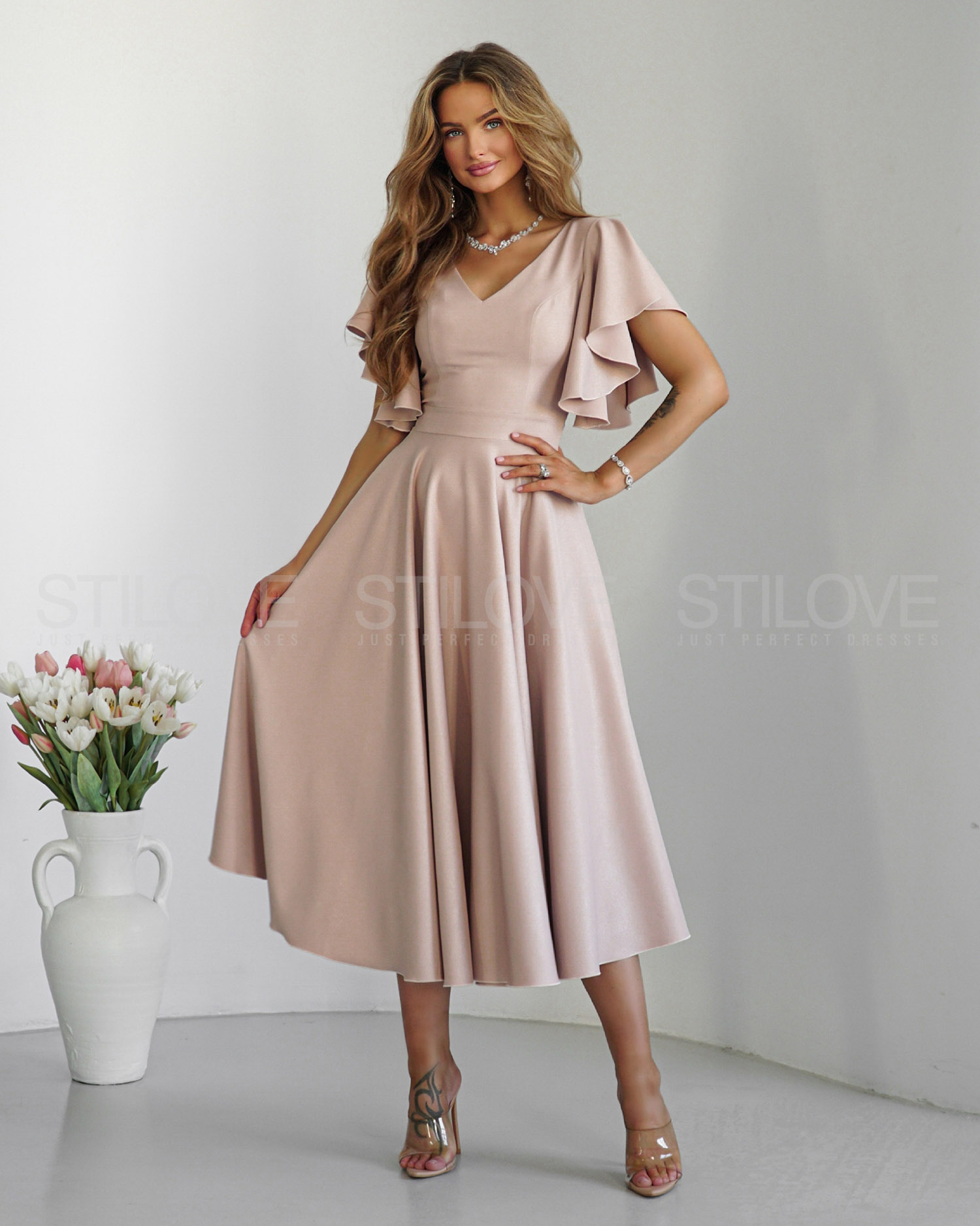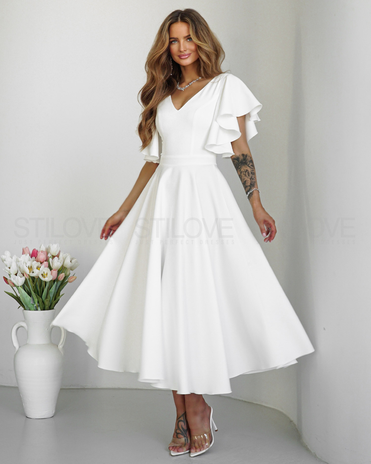 Wyjątkowa sukienka uszyta z pełnego koła, dzięki czemu przepięknie układa się podczas ruchu. Kloszowany dół w modnej długości 7/8 dodaje lekkości i elegancji, a dopasowana góra z efektownymi rękawkami w formie falbanek podkreśla ramiona i nadaje całości romantycznego charakteru.