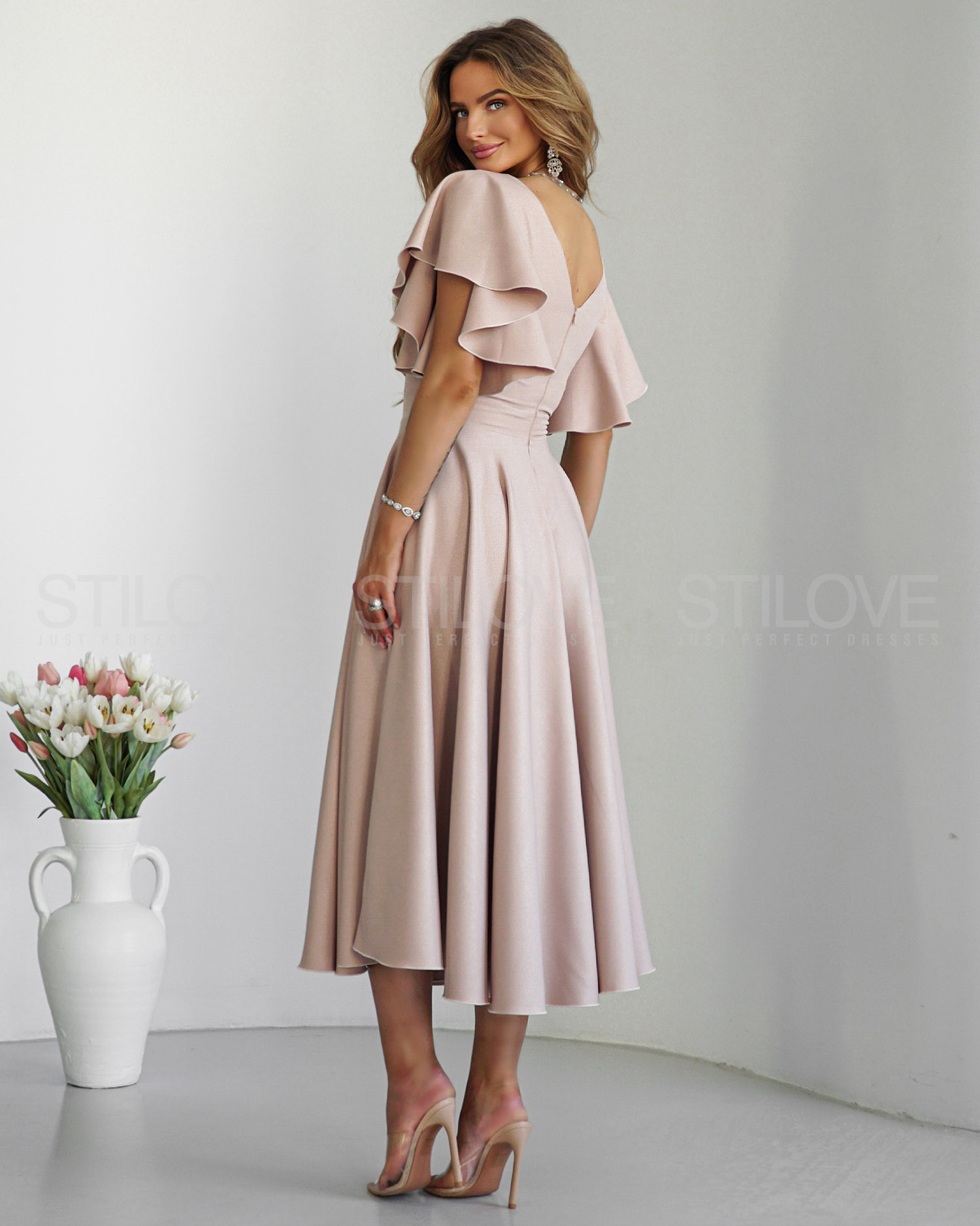 Wyjątkowa sukienka uszyta z pełnego koła, dzięki czemu przepięknie układa się podczas ruchu. Kloszowany dół w modnej długości 7/8 dodaje lekkości i elegancji, a dopasowana góra z efektownymi rękawkami w formie falbanek podkreśla ramiona i nadaje całości romantycznego charakteru.