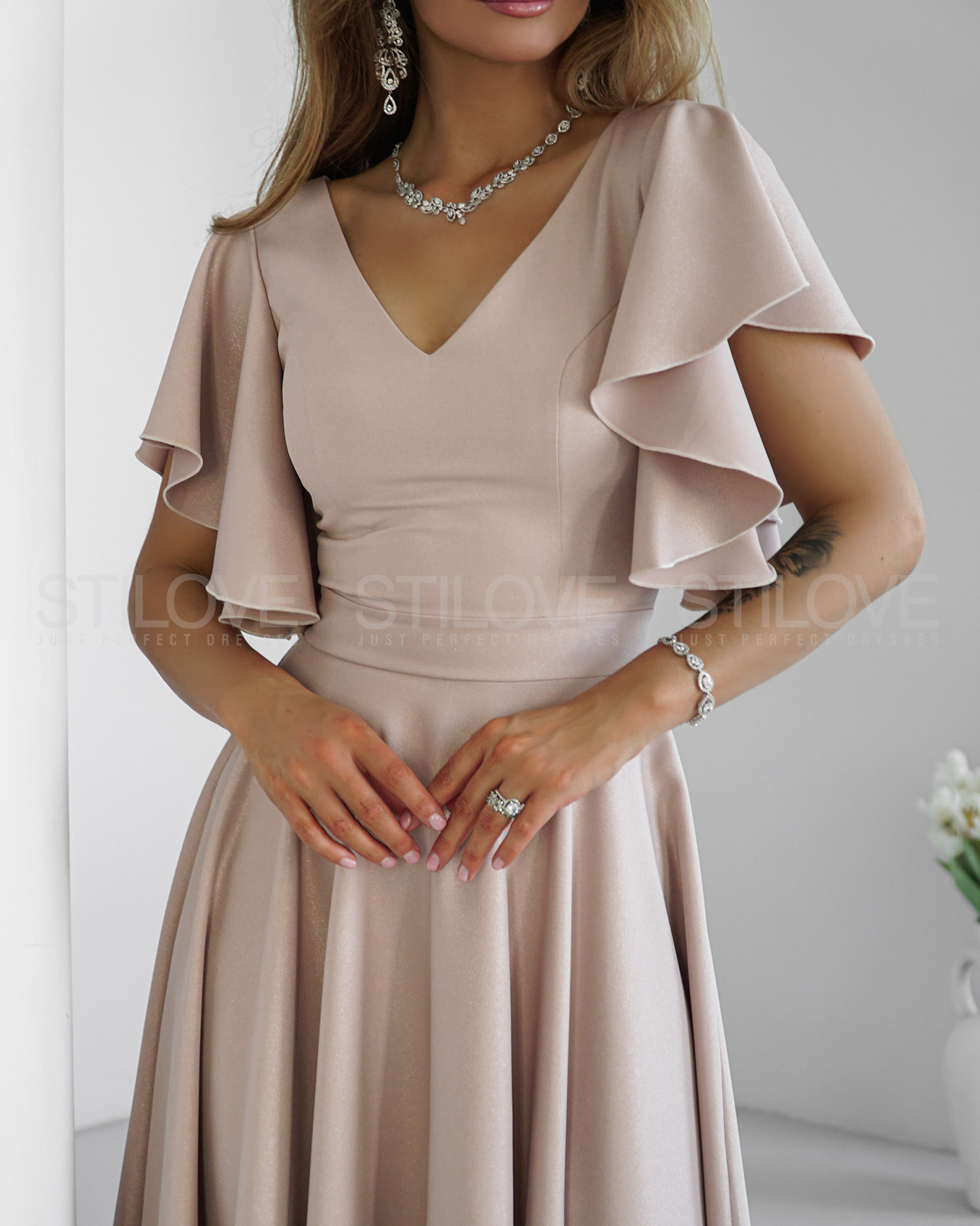 Odcinana w pasie konstrukcja doskonale modeluje sylwetkę, a lekko elastyczny, połyskujący materiał idealnie dopasowuje się do ciała i subtelnie mieni się przy każdym kroku. Sukienka zapinana jest z tyłu na kryty zamek, co zapewnia wygodę i estetyczne wykończenie.