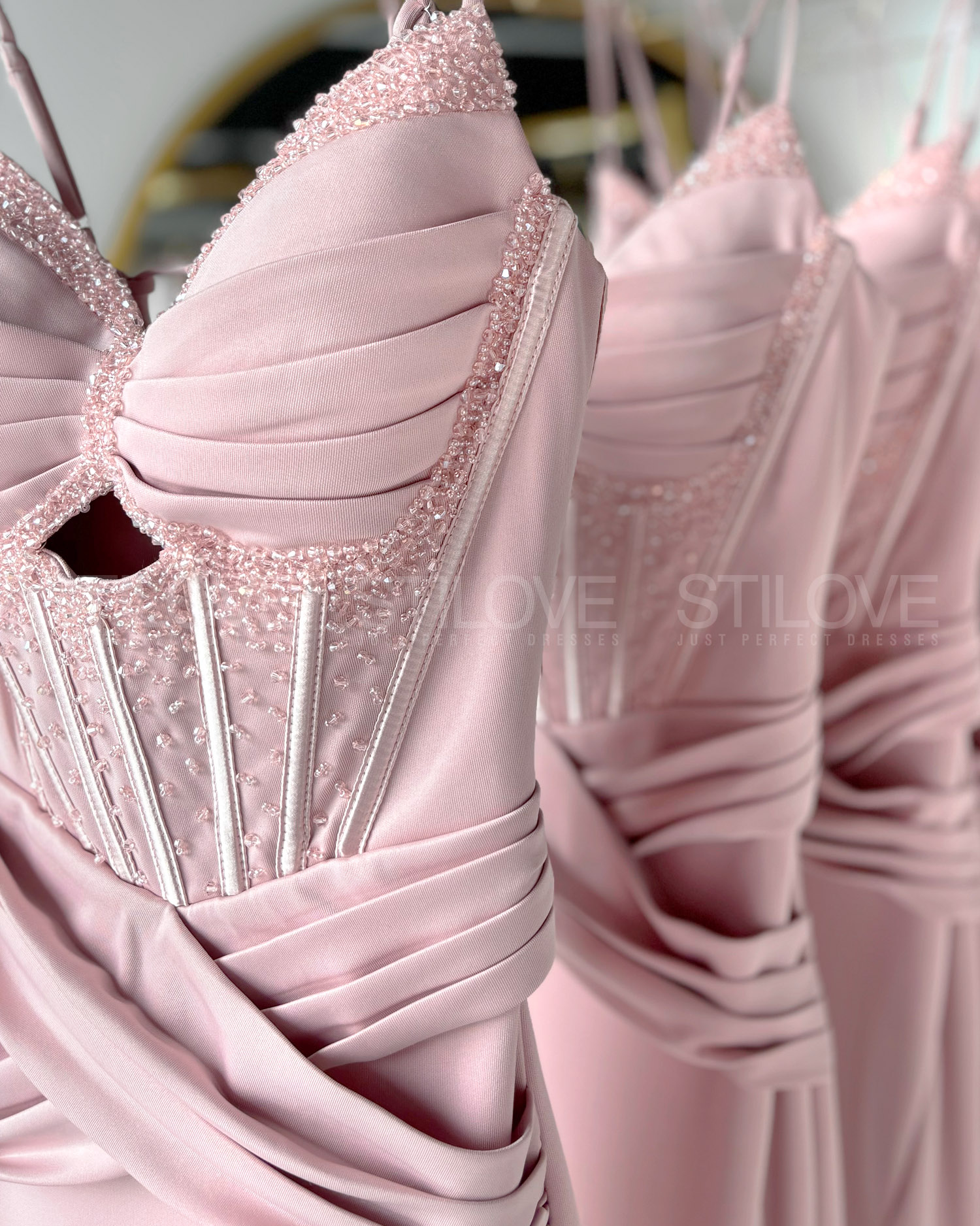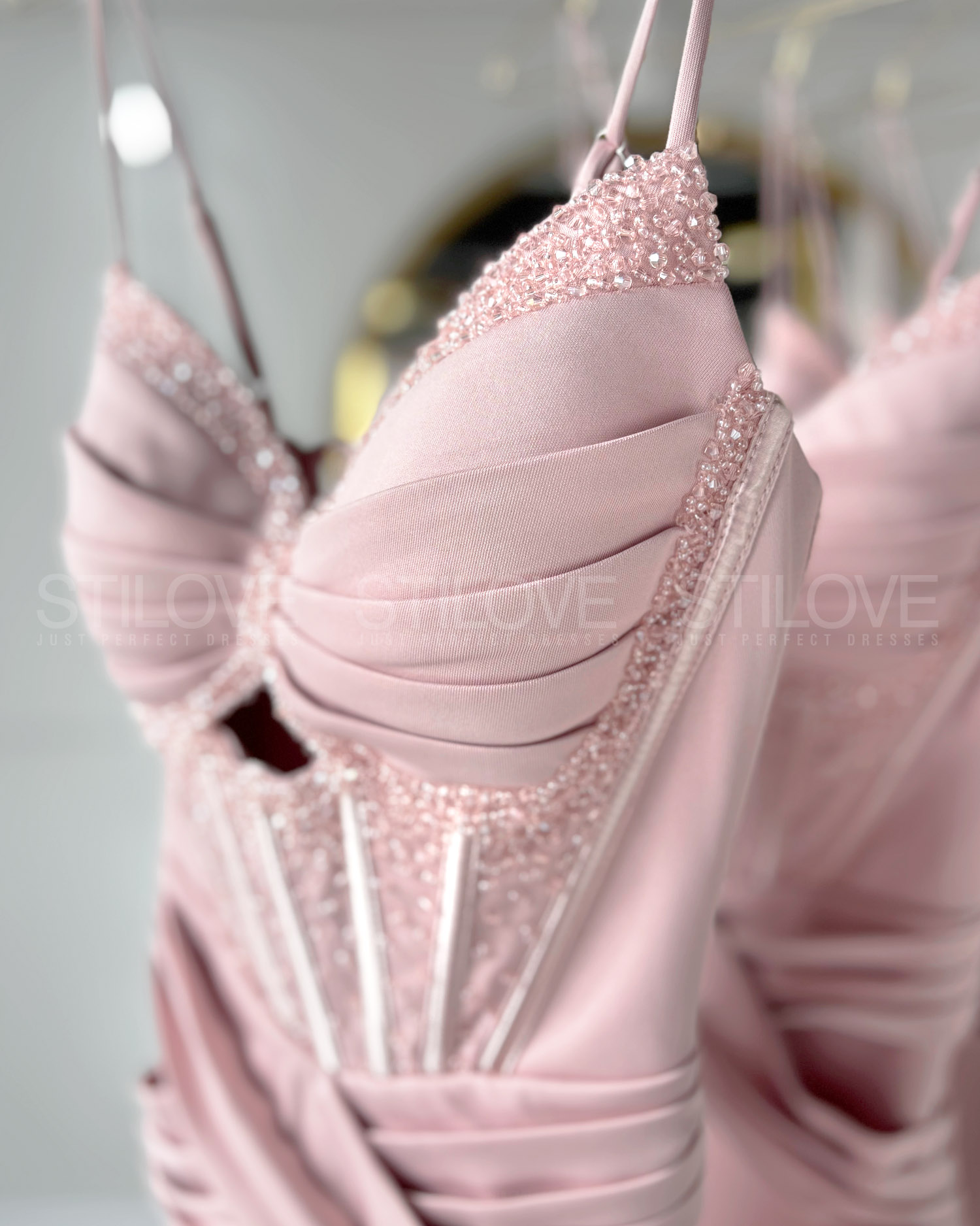 Zachwyca cienkimi, regulowanymi ramiączkami oraz wiązaniem z tyłu zapewniającym idealne dopasowanie, a wszyte miseczki komfortowo zastępują bieliznę. Dekolt ozdobiony drobnymi koralikami dodaje jej subtelnego blasku, zmysłowe wycięcie pod biustem, efektowne drapowanie w pasie optycznie wyszczuplające sylwetkę. Marszczenie z tyłu podkreślające kobiece kształty, a rozcięcie na nogę pięknie ją eksponuje.